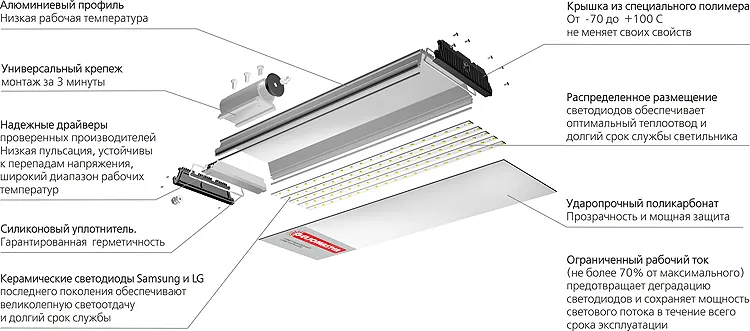 - Мощный алюминиевый корпус-радиатор обеспечивает низкую рабочую температуру светильника.